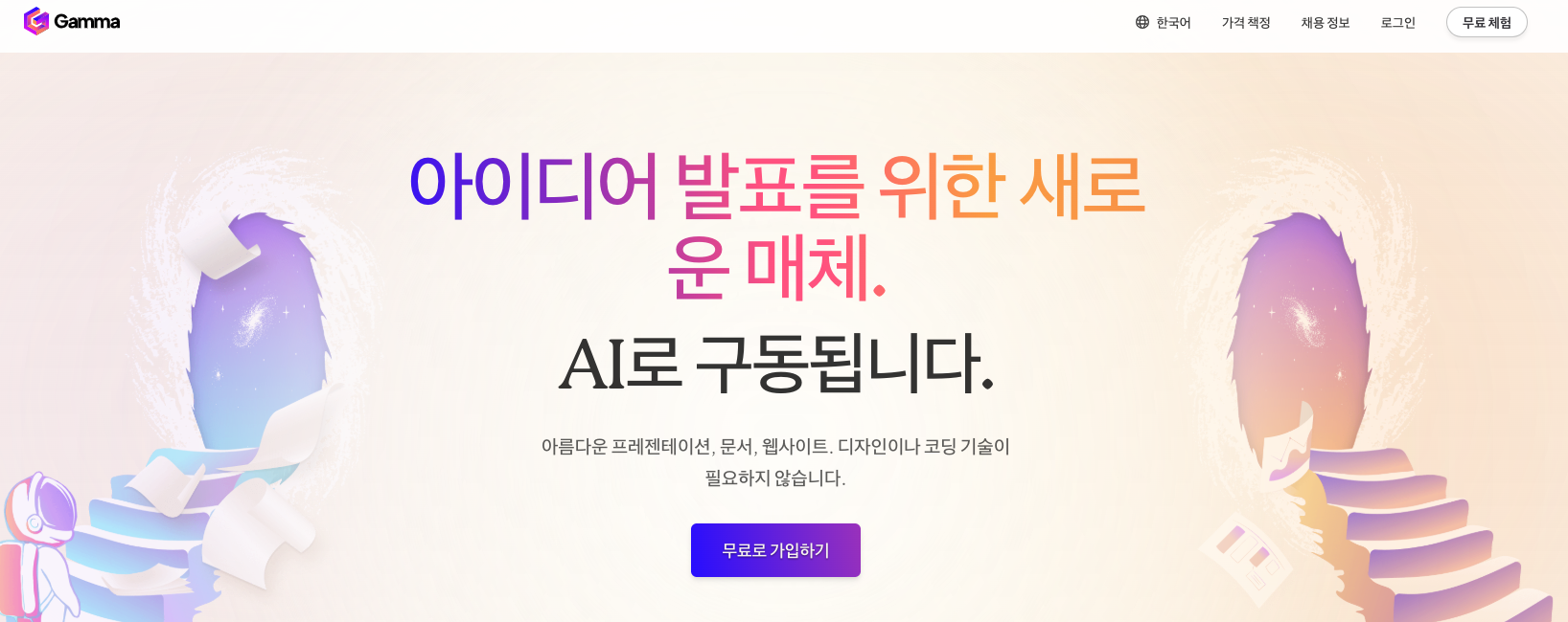 먼저 감마AI에 접속해 주세요. 사이트에 들어가면 화면 중앙에 "무료로 가입하기" 버튼이 보입니다. 이 버튼을 눌러 간단하게 계정을 생성하세요. 구글 계정으로도 손쉽게 로그인할 수 있으니 편리합니다.