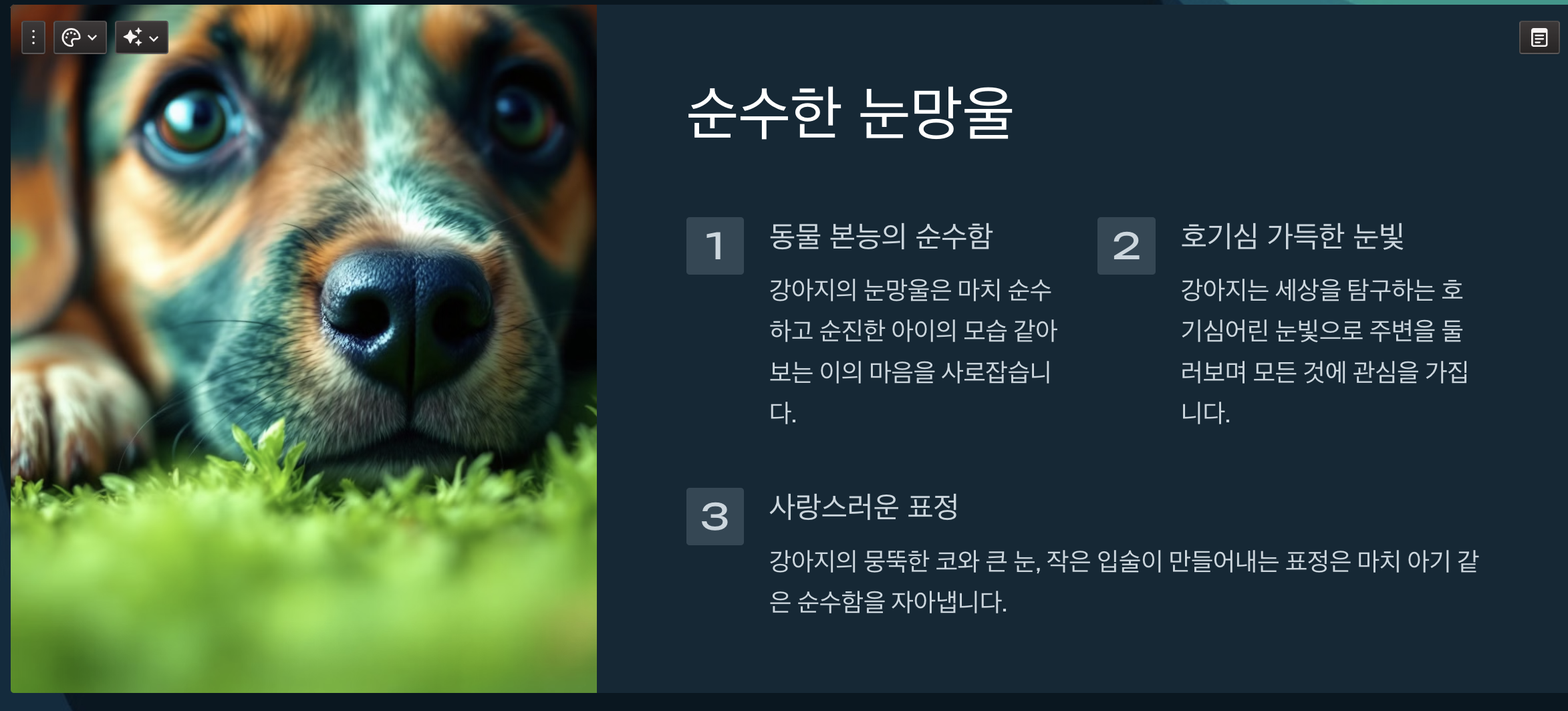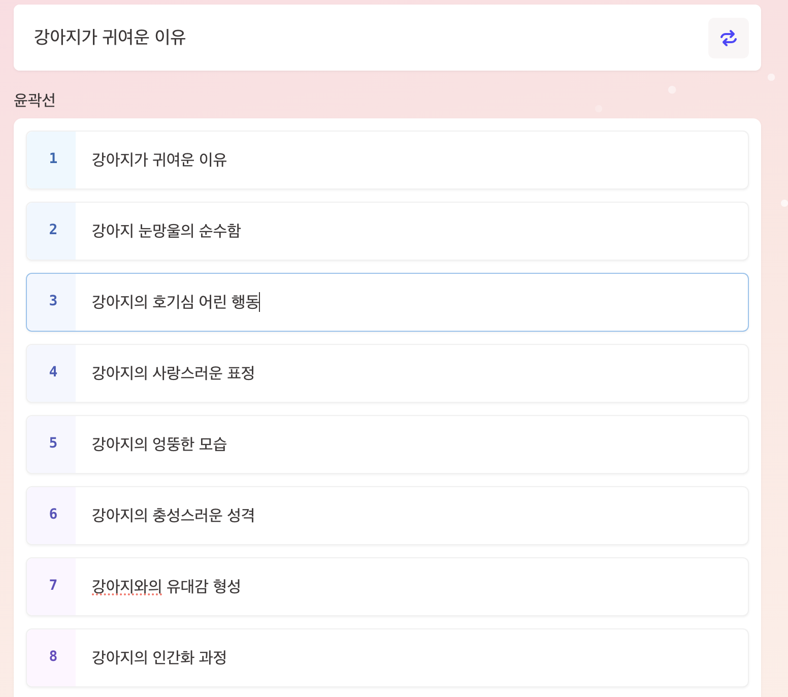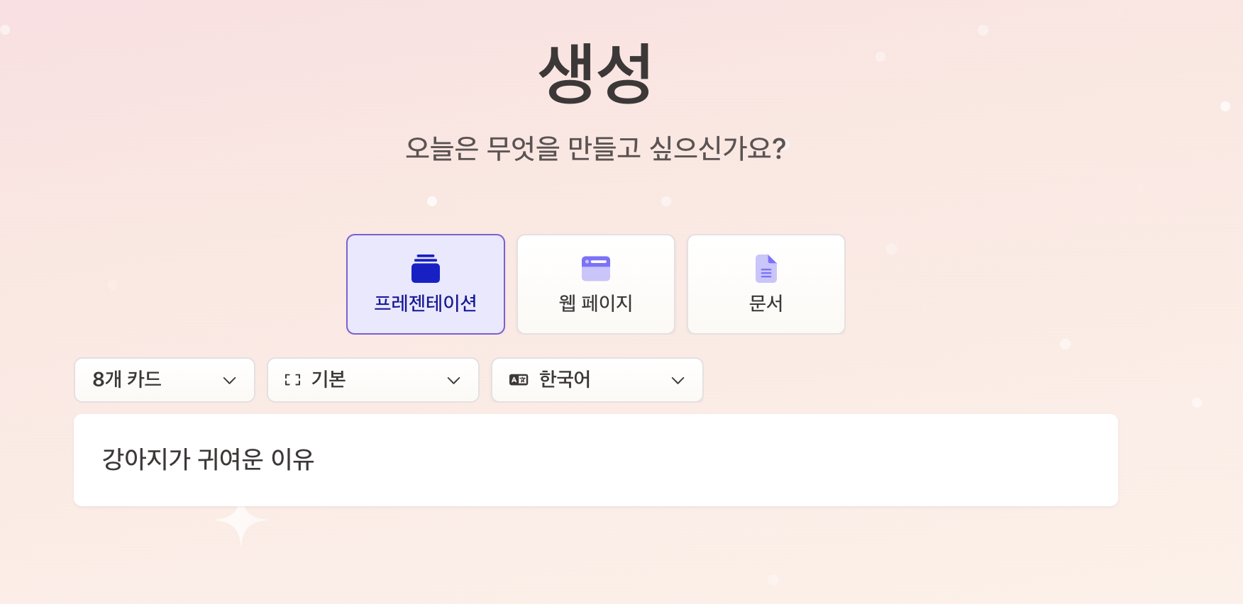 복잡한 설정이나 그래픽 디자인 기술이 필요 없습니다. 그냥 만들고 싶은 주제를 텍스트로 입력하기만 하면 끝입니다. 정말로 그냥 주제만 이력하면 됩니다. 예를 들어서 강아지가 귀여운 이유라고 주제를 입력하면 무료버전에서는 최대 10장까지의 개요가 1초만에 나옵니다