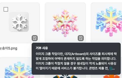 약 2주 정도 지나고 결과가 나왔습니다. 그런데 첫 승인 심사는 거절이었습니다. 퀄리티가 문제인가? 라고 생각했는데 친절하게 거절 이유가왔습니다. 거부 사유는 크롭작업이 안되어있다 였습니다. 그리고 이 작업에 대해서는 미리캔버스 측에서 가이드를 친절하게 제공해줍니다.