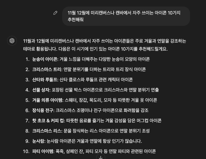 11월 12월에 자주 쓰이는 아이콘 10가지 추천해줘 이렇게 간단하게 물어봅니다.