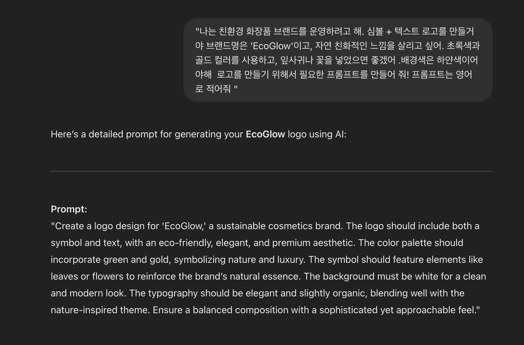 ChatGPT나 Claude 같은 AI 챗봇을 활용하면 적절한 로고 디자인 아이디어와 프롬프트(명령어)를 얻을 수 있습니다.