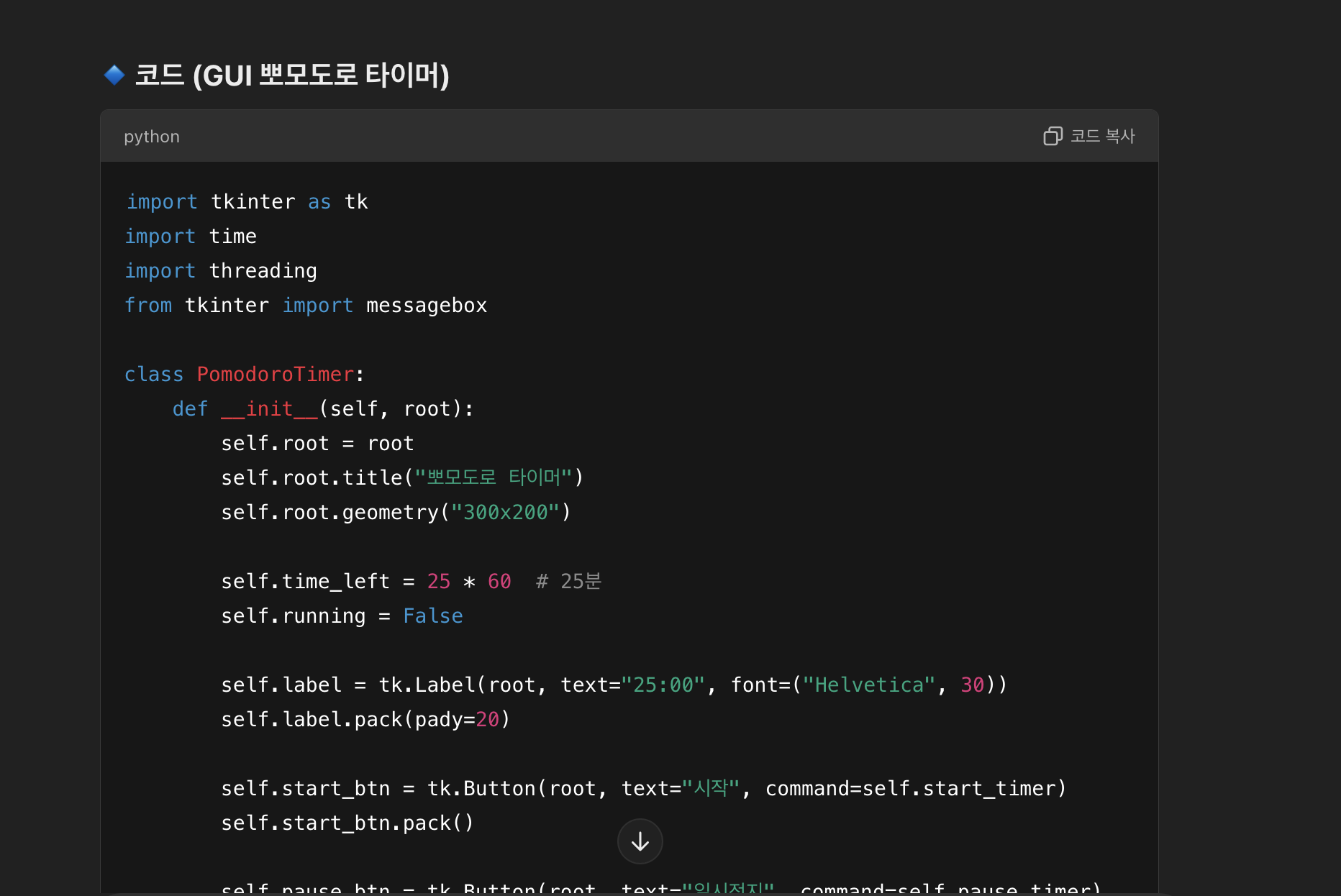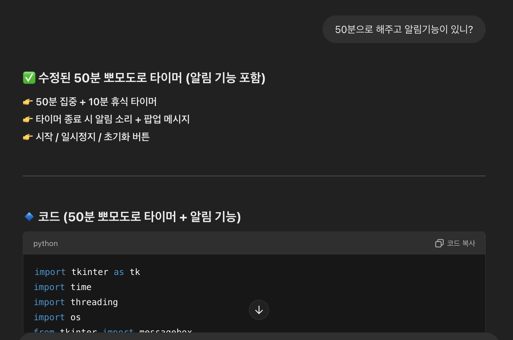 - "Python으로 뽀모도로 타이머를 만들어줘"