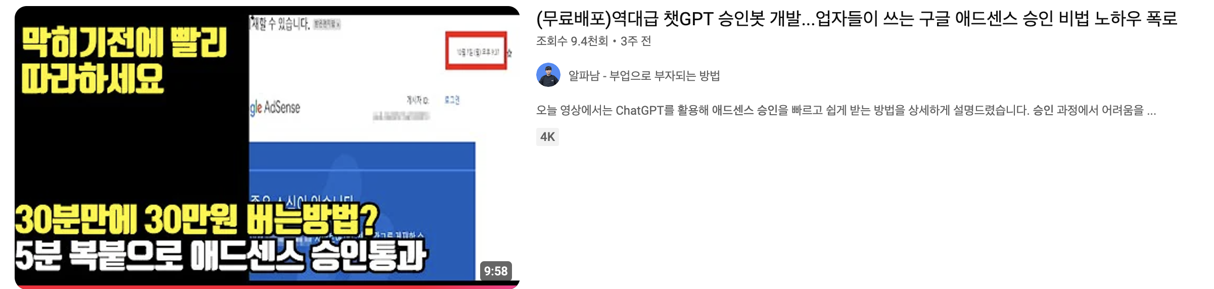 유튜브를 검색하자마자 바로 눈에 띄는 썸네일이 있었습니다. 5분 복붙으로 애드센스 승인통과라는 유튜브 썸네일을 발견했습니다.